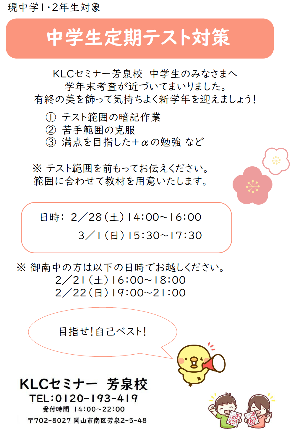 上記の定期対策の日程のころはもう直前の時期です。皆さんがどのくらいできるようになっているかが楽しみです。それでは学年末対策で!!