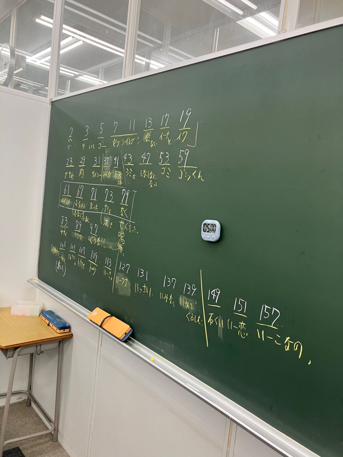 ↓↓授業のあいまに4年生と一緒に素数のごろ合わせを考えているところです。