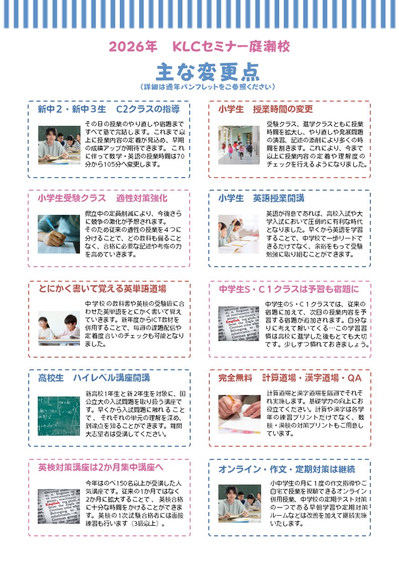 さて、KLCセミナーでは2月1日から新年度のスタートです。庭瀬校でも新年度に様々な変更点があります。