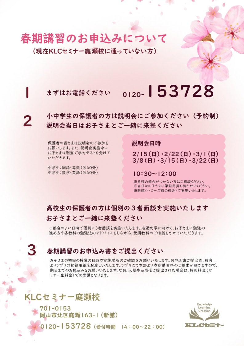 さて、KLCセミナーでは2月1日から新年度のスタートです。庭瀬校でも新年度に様々な変更点があります。