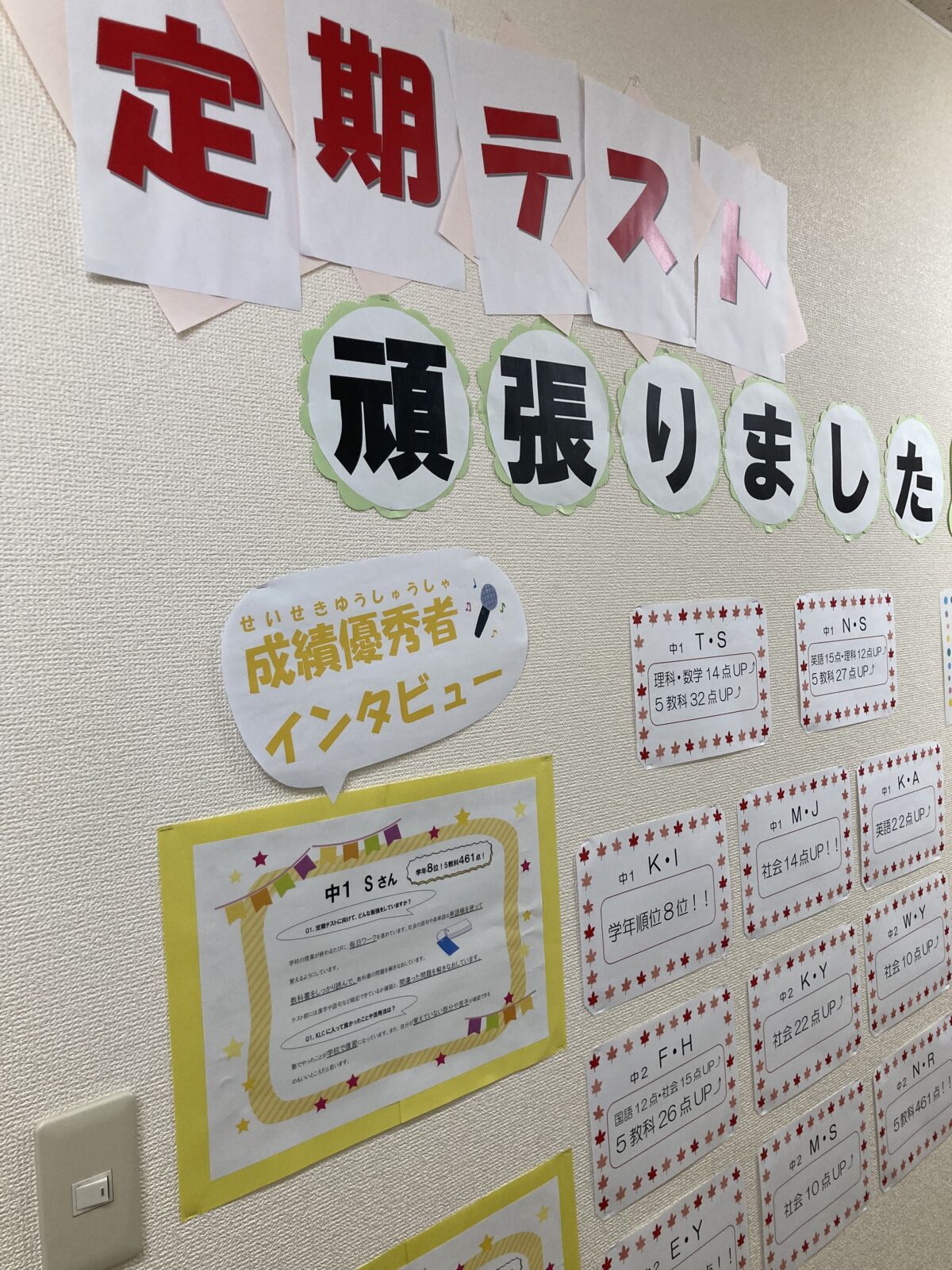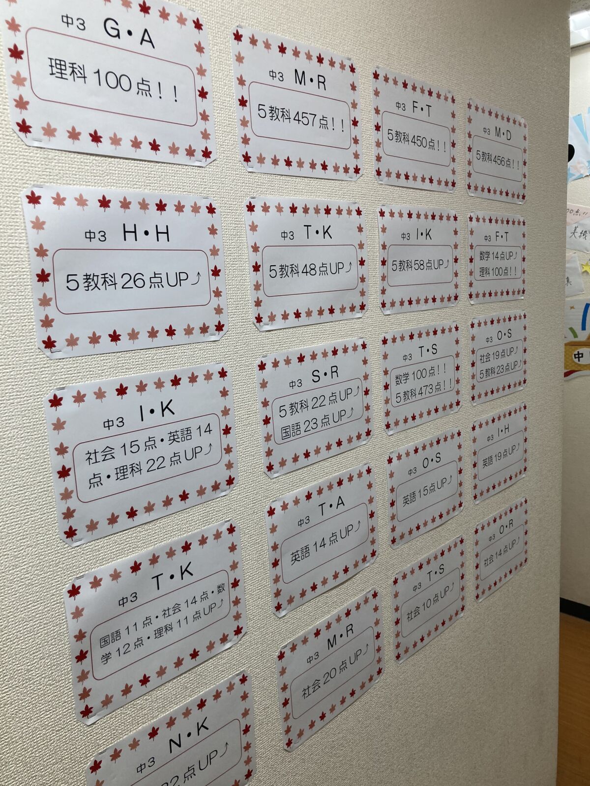 成績向上者がこんなにたくさん!前回のテストに比べて大きく成長しました。また、満点の生徒や5科450点以上学年トップ10内の生徒もたくさんいました。日々の努力の成果ですね!!
