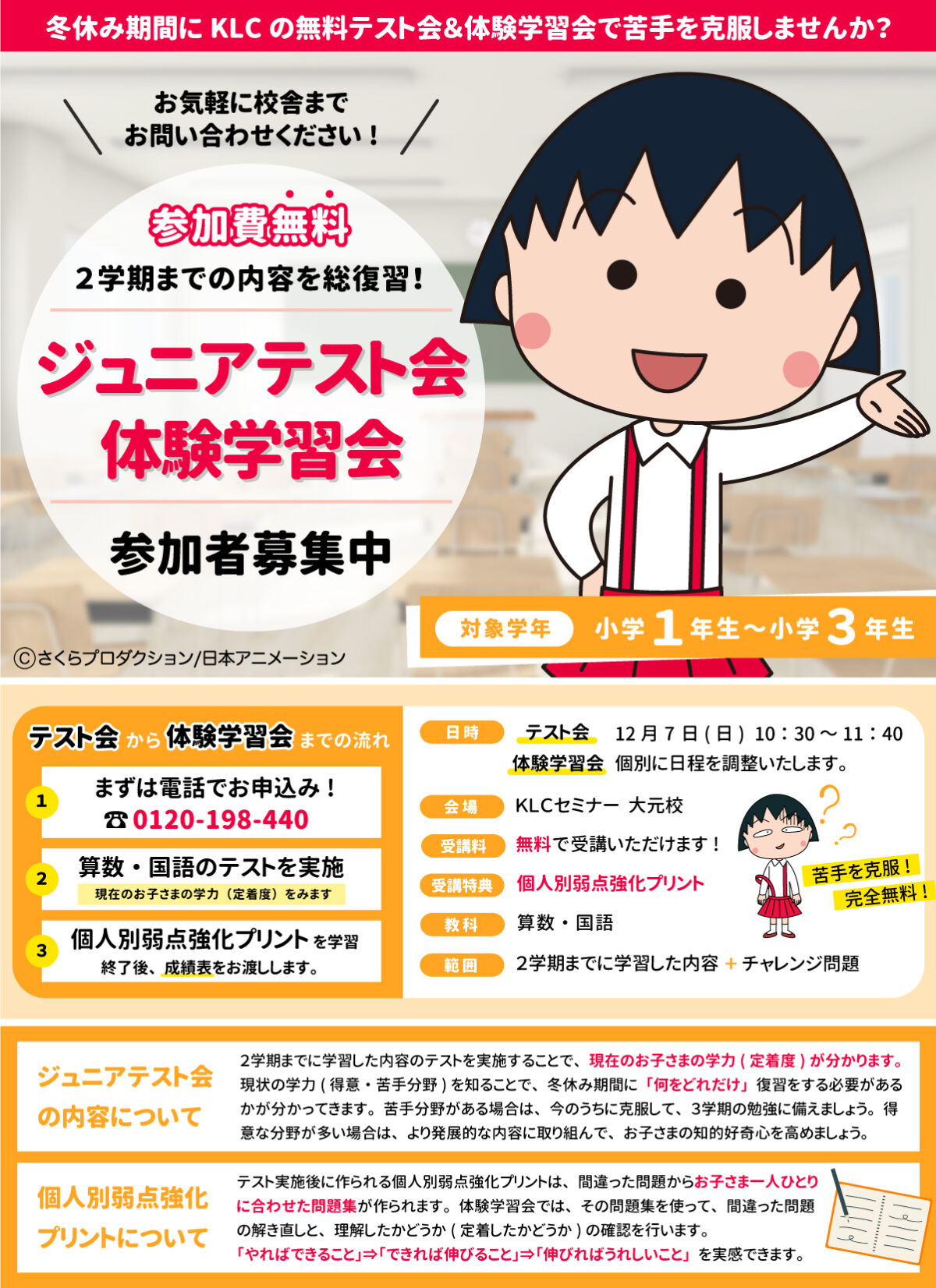 2025年11月4日参加費無料!参加者募集中! 2学期までに学習した内容を総復習!この夏、KLCの無… -